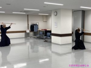 小太刀での誘いと大太刀の協調・一致の技術が必要になる型。体捌き、半身の学びとしても面白い型なので、単独動作から練習していく。切落と体捌きを解説を交えながら、一足一刀の間合いを維持しながら練習していく。この型の最初のポイントは、小太刀・大太刀の連動と体捌きを一致させるところにある。型としての間合い・拍子・中心への捉えなどは、その先の技術となる。