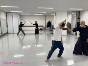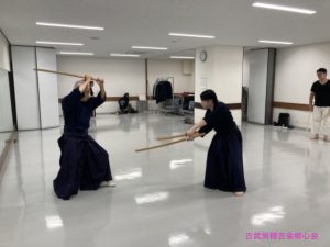各種基本:構えをとってから、歩法・寄り・詰めと相対で稽古していく。小太刀という圧倒的不利な道具を持ちながら、心身を遣い制する一端を其々から確認してもらう。特に詰める技術は切落を踏まえての要素となる。これが出来てこないとおさえる技術に繋がらないので各位の工夫に期待する。
