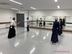剣術:廻剣から初めて身体の固さをゆっくりとほぐしていく。稽古の流れを確認しながら打ち・受けから入っていく。