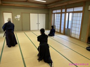 坐居合:八本目を稽古していく。腹抜からの切先返をした際の刀がどの位置に、どの様になるのかを伝える。型としてはまずは直線的に抜いていく。直線と胸の緩み・体の入れかえなど一致すべき点が増え難しくなる型なので、何がいま出来ていないのかを観て受け入れていく。