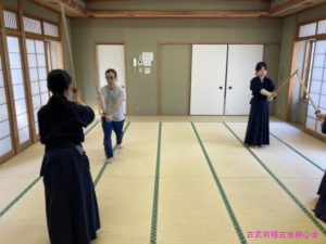 剣術:古傳型の最初に教わる形を流して稽古していく。さほど説明しないで進めたので、会員諸氏は面食らった雰囲気だったが気にせず進める。これまで稽古してきたことを理解できていれば難しくない動き。